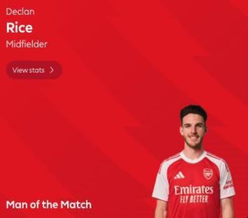 最终经过英超官网球迷投票,赖斯以51%的得票率当选全场最佳球员。
