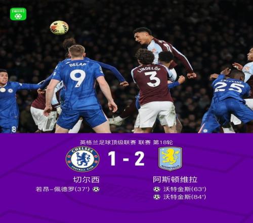 北京时间12月28日英格兰足球顶级联赛 联赛 第18轮,切尔西主场对阵阿斯顿维拉。切尔西若昂-佩德罗破门。阿斯顿维拉沃特金斯梅开二度。最终比分切尔西 1-2 阿斯顿维拉。