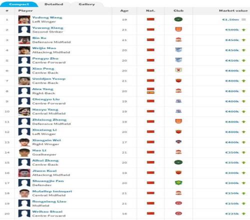 中超球员身价榜: